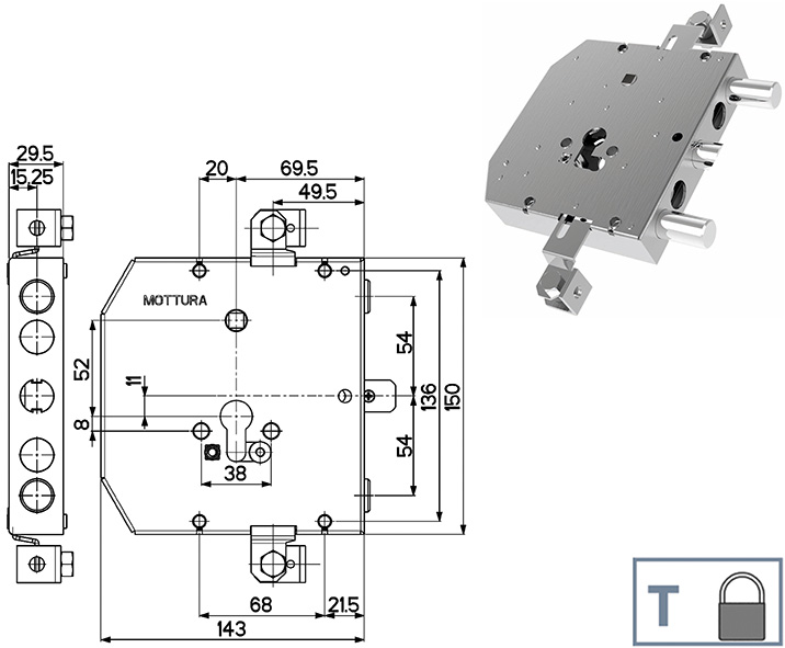 Serratura triplice per porte blindate ESETY TESIO. Reversibile. Per cilindro europeo, non in dotazione da ordinare a parte. Dotata di blocco antieffrazione (trappola). 2 catenacci INTERASSE MM.54 corsa mm.29 e SCROCCO CENTRALE. Entrata chiave mm.69,5. Entrata maniglia mm.69,5. Quadro mm.8. Corsa aste mm.14. SBALZI PREMONTATI con distanziatori. Da abbinare a placche ns.cod.843743 a 843748.