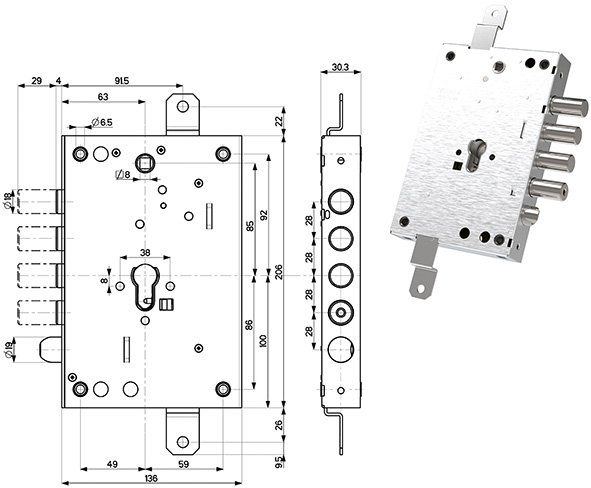 Serratura applicare triplice per porte blindate. Reversibile. Per cilindro europeo, non in dotazione, da ordinare a parte. Attacco cilindro unificato. Dotata di blocco antieffrazione (trappola) e rinforzo catenacci. 4 catenacci e scrocco. Quadro mm.8. ENTRATA MM.63. Catenacci con corsa mm.29. Corsa aste mm.20. Doppia possibilit? di attacco, DADI IN GABBIA oppure con BOCCOLE.