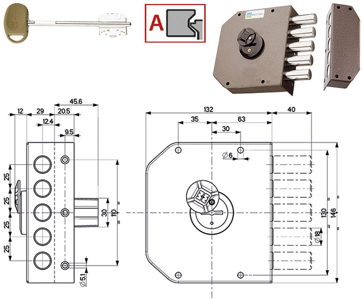 Serratura doppia mappa ANTIDECODUE da applicare verniciata. Laterale con 5 catenacci. Entrata 63. 4 mandate. Corsa catenacci mm.40. Apertura interna ed esterna con chiave. Con 3 chiavi (92106/4). Figura mano Dx.