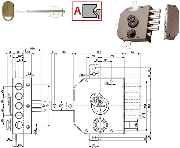 Serratura doppia mappa ANTIDECODUE da applicare verniciata. Quintuplice con 4 catenacci e scrocco. Entrata 63. 4 mandate. Corsa catenacci mm.40. Apertura interna ed esterna con chiave. Con 3 chiavi (92106/4). Senza aste (93141) e deviatore (96143) da ordinare a parte. Figura mano Dx.