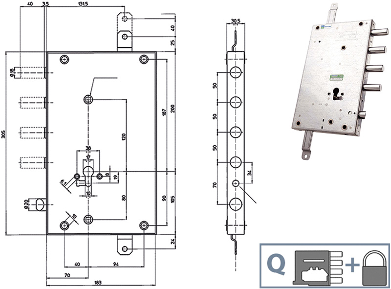 Serratura applicare tipo SERRABLINDA triplice per porte blindate. Comando catenacci mediante pomolo e blocco con chiave. Per cilindro europeo, non in dotazione, da ordinare a parte. Blocco antieffrazione. 4 cat. int.mm.50 e scrocco. Q mm.8. Entrata mm.70. Corsa catenacci mm.40. 2 mandate. Corsa aste mm.40. 1/2 giro azionato dalla maniglia. Da abbinare a placche ns.cod.843221, 843222, 843223.